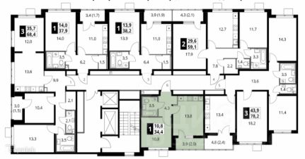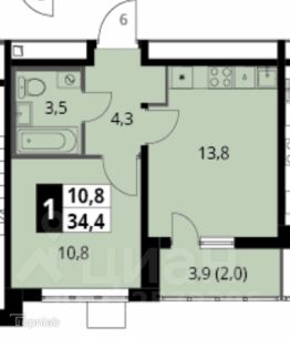 Общая площадь квартиры — 34,4 кв. м., этаж 20 из 25, секция 2