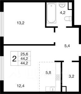 Общая площадь 44 м2; жилая 25,60м2; комнаты 14,20м2-10,80м2; кухня- ниша 5,80 м2; С/У 4,20 м2;