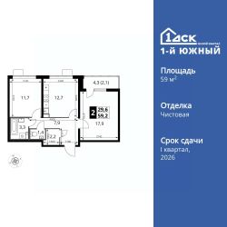 Продаётся 2-к квартира номер 82 общей площадью 59.1 кв.м. на 22-м этаже 25 этажного здания. Чистовая отделка. Цена с учётом скидки.