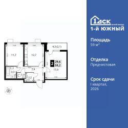 Продаётся 2-к квартира номер 182 общей площадью 59.1 кв.м. на 23-м этаже 25 этажного здания. Отделка Whitebox. Цена с учётом скидки.