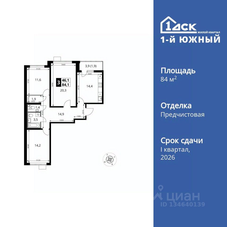 Продаётся 3-к квартира номер 257 общей площадью 84.1 кв.м. на 12-м этаже 25 этажного здания. Отделка Whitebox. Цена с учётом скидки.