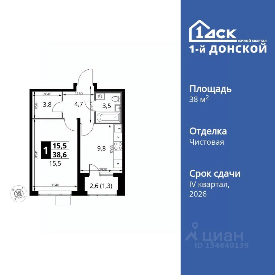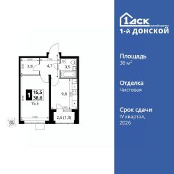 Продаётся 1-к квартира номер 221 общей площадью 38.6 кв.м. на 24-м этаже 24 этажного здания. Чистовая отделка.