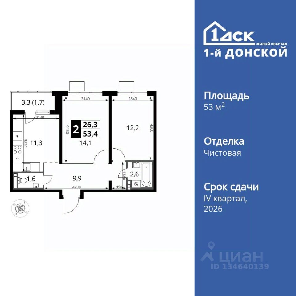 Продаётся 2-к квартира номер 167 общей площадью 53.4 кв.м. на 18-м этаже 24 этажного дома. Чистовая отделка.