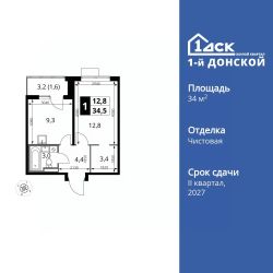 Продаётся 1-к квартира номер 357 общей площадью 34.5 кв.м. на 12-м этаже 24 этажного здания. Чистовая отделка.