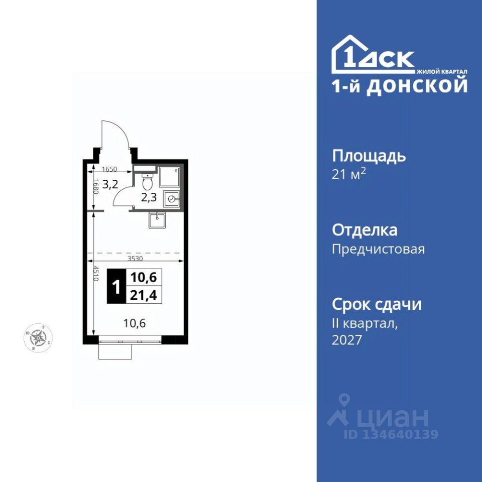 Продаётся квартира-студия номер 720 общей площадью 21.4 кв.м. на 23-м этаже 24 этажного дома. Отделка Whitebox.
