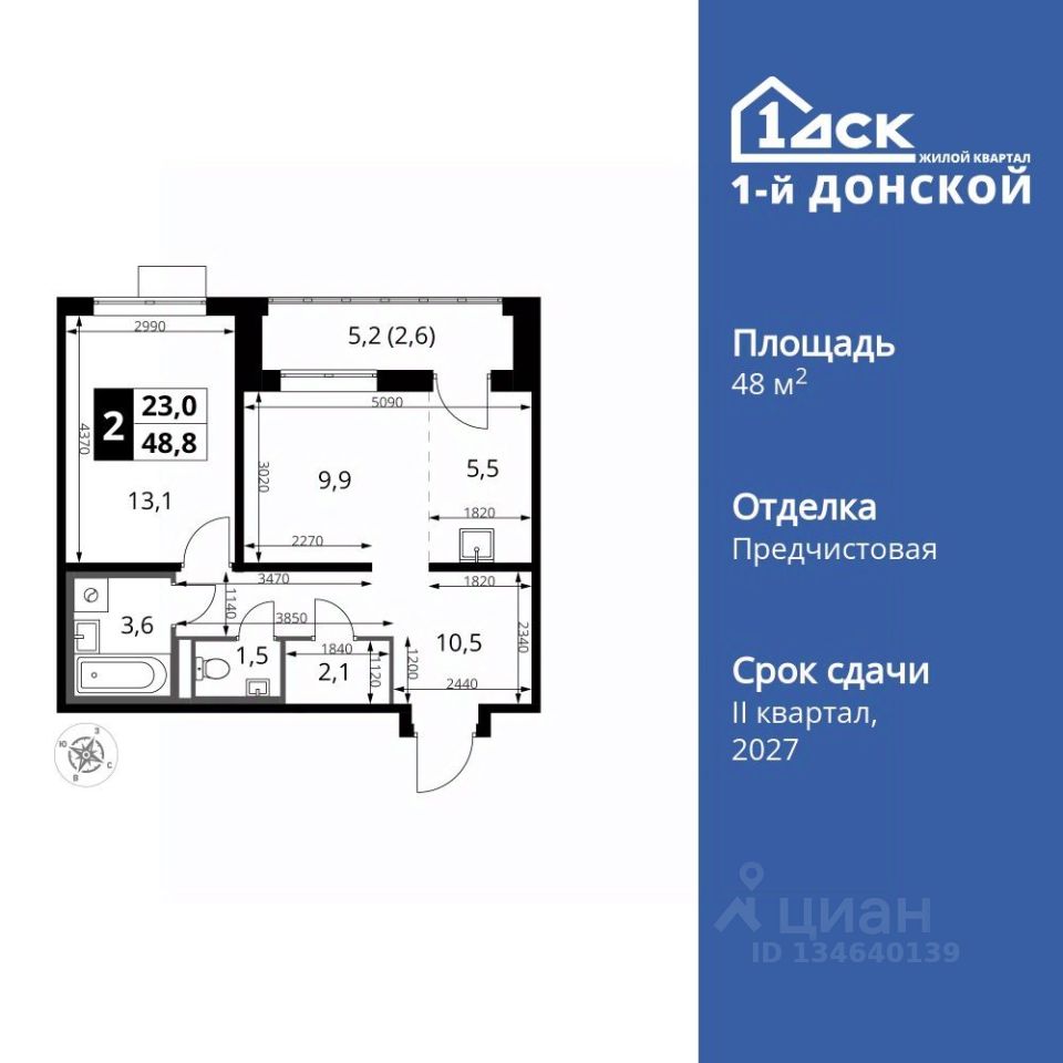 Продаётся 2-к квартира номер 614 общей площадью 48.8 кв.м. на 13-м этаже 24 этажного здания. Отделка Whitebox.