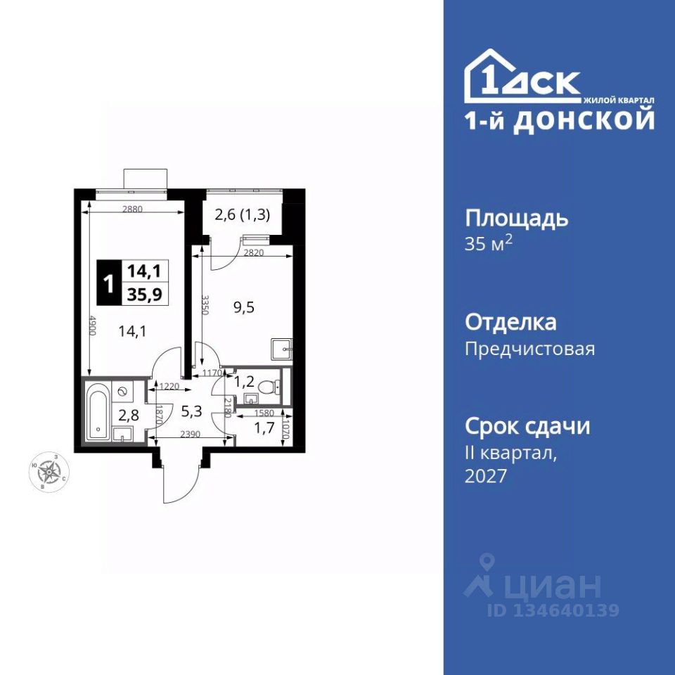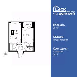 Продаётся 1-к квартира номер 549 общей площадью 35.9 кв.м. на 7-м этаже 24 этажного здания. Отделка Whitebox.