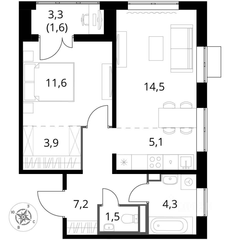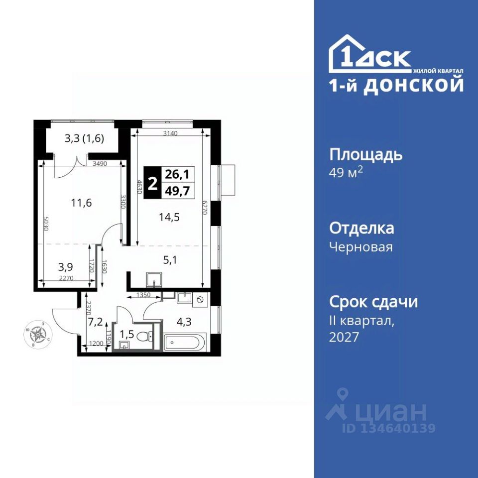 Продаётся 2-к квартира номер 584 общей площадью 49.7 кв.м. на 11-м этаже 24 этажного дома. Отделка Whitebox.