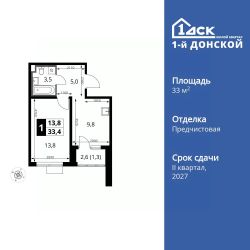 Продаётся 1-к квартира номер 569 общей площадью 33.4 кв.м. на 9-м этаже 24 этажного здания. Отделка Whitebox.
