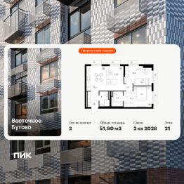 Продаётся 2-комн. квартира площадью 51,9 кв.м на 21 этаже 25 этажного дома (Корпус 55, Секция 1) проекта ПИК Восточное Бутово. Светлый просторный подъезд на уровне земли, функциональная планировка, большие окна, предчистовая отделка.