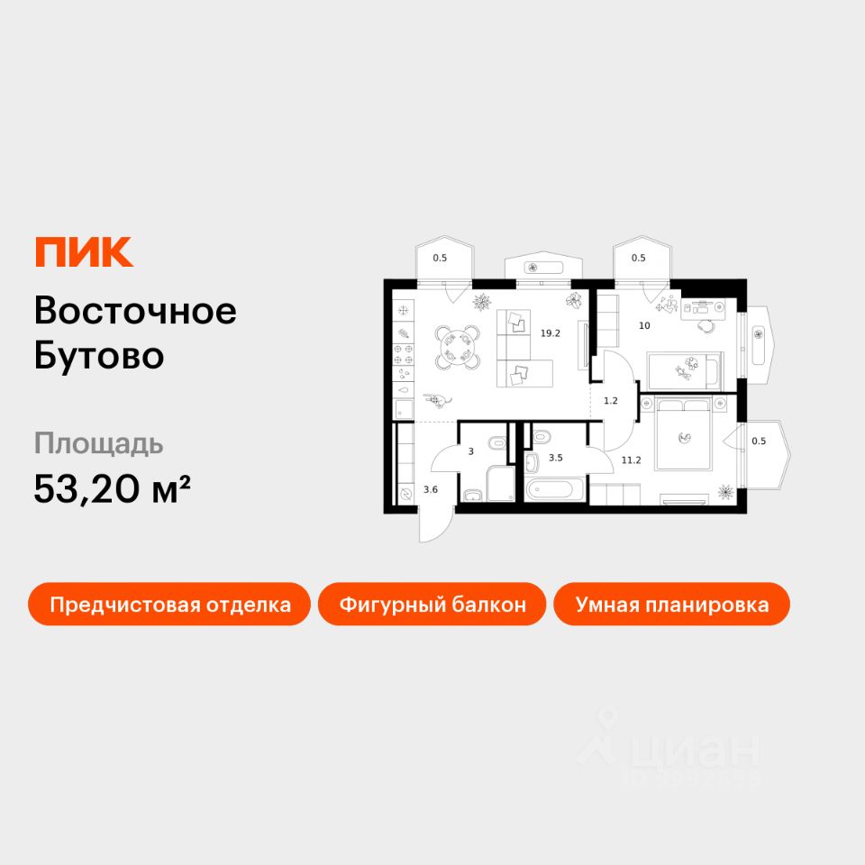 Продаётся 2-комн. квартира площадью 53,2 кв.м на 3 этаже 25 этажного дома (Корпус 55, Секция 1) проекта ПИК Восточное Бутово. Светлый просторный подъезд на уровне земли, функциональная планировка, большие окна, предчистовая отделка.