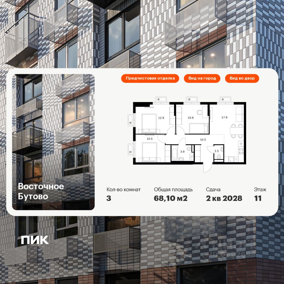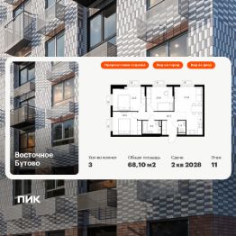 Продаётся 3-комн. квартира площадью 68,1 кв.м на 11 этаже 25 этажного дома (Корпус 48, Секция 4) проекта ПИК Восточное Бутово. Светлый просторный подъезд на уровне земли, функциональная планировка, большие окна, предчистовая отделка.