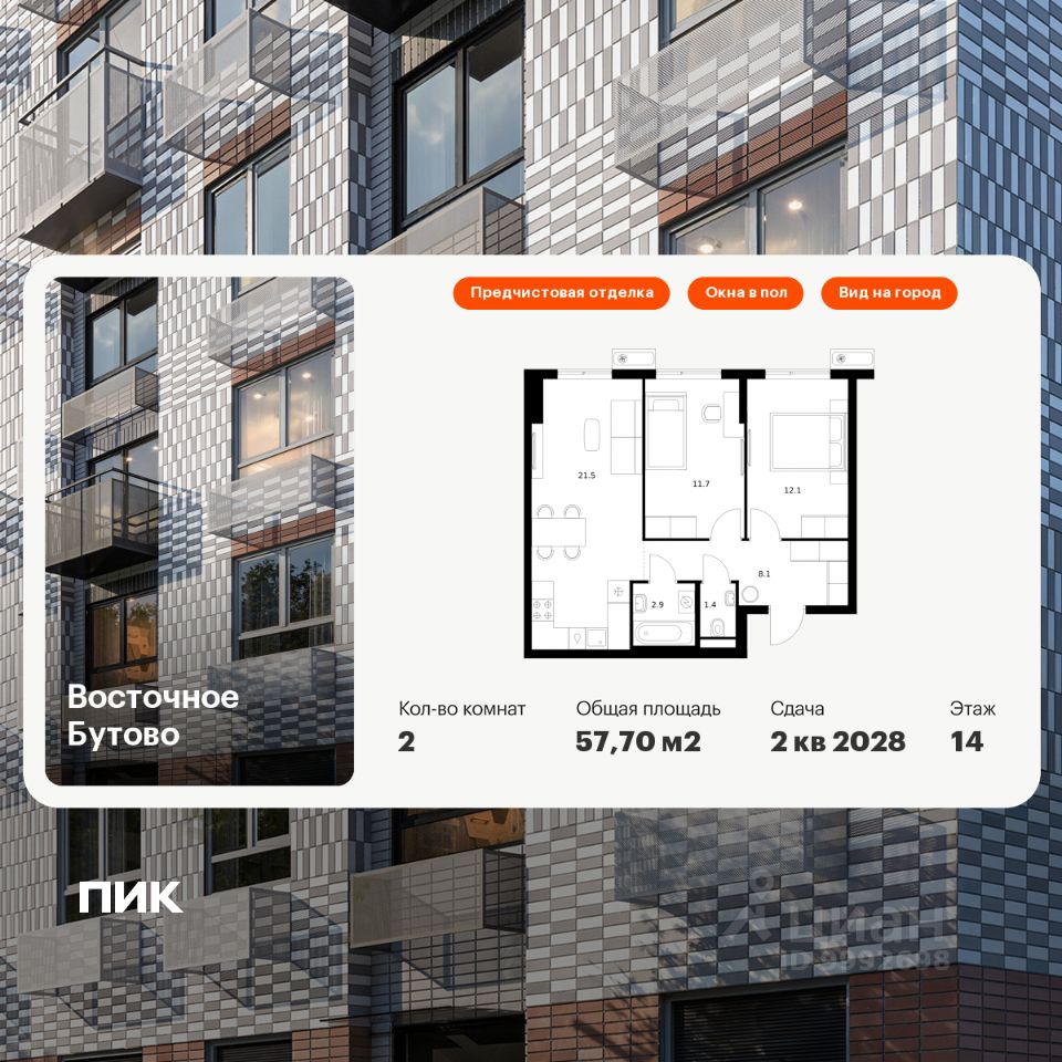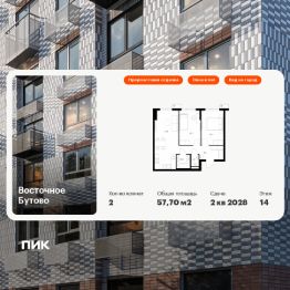 Продаётся 2-комн. квартира площадью 57,7 кв.м на 14 этаже 17 этажного дома (Корпус 48, Секция 2) проекта ПИК Восточное Бутово. Светлый просторный подъезд на уровне земли, функциональная планировка, большие окна, предчистовая отделка.
