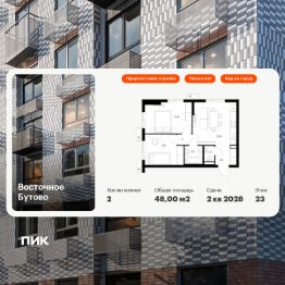 Продаётся 2-комн. квартира площадью 48 кв.м на 23 этаже 25 этажного дома (Корпус 48, Секция 4) проекта ПИК Восточное Бутово. Светлый просторный подъезд на уровне земли, функциональная планировка, большие окна, предчистовая отделка.
