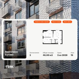 Продаётся 2-комн. квартира площадью 48 кв.м на 15 этаже 25 этажного дома (Корпус 48, Секция 4) проекта ПИК Восточное Бутово. Светлый просторный подъезд на уровне земли, функциональная планировка, большие окна, предчистовая отделка.