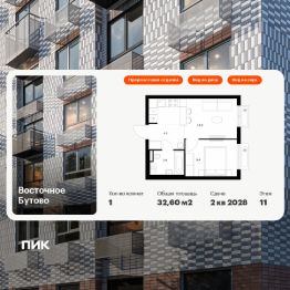 Продаётся 1-комн. квартира площадью 32,6 кв.м на 11 этаже 17 этажного дома (Корпус 48, Секция 1) проекта ПИК Восточное Бутово. Светлый просторный подъезд на уровне земли, функциональная планировка, большие окна, предчистовая отделка.