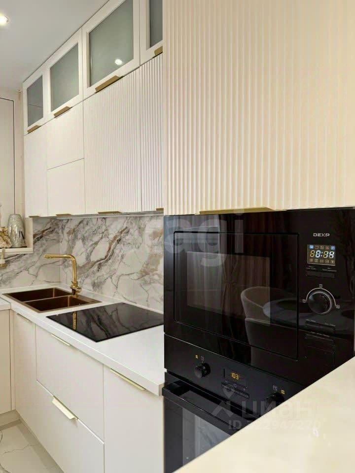 Кухня-гостиная: Сердце квартиры просторная зона с барной стойкой, где удобно готовить и общаться. Встроенная система хранения и премиальная кухня с техникой (микроволновка, духовой шкаф, плита) от ведущих производителей, а также сантехника Grocenberg, делают эту зону по-настоящему функциональной и стильной.