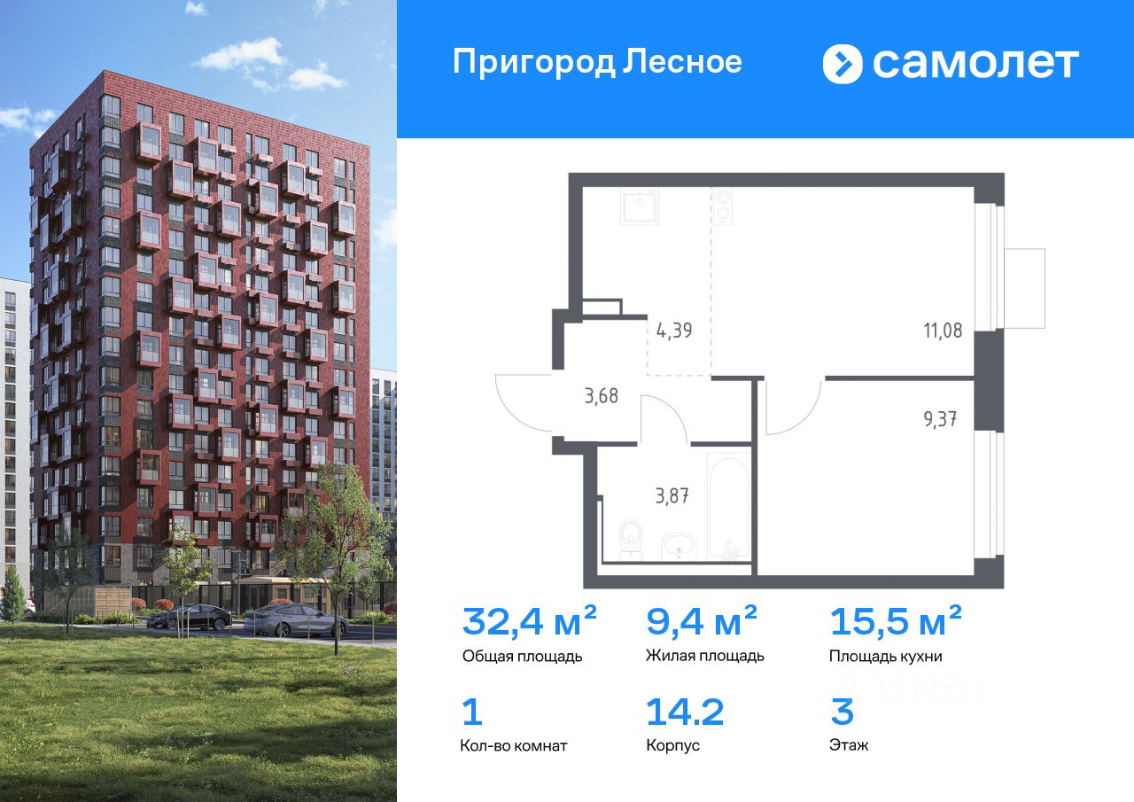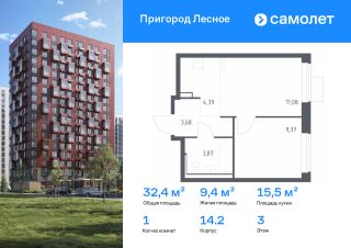 Строим кварталы для жизни с заботой о будущем. Предлагается 1-комнатная квартира комфорт-класса 32,39 кв.м в корпусе 14.2 на 3 этаже, в ЖК "Пригород Лесное"