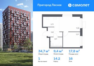 Строим кварталы для жизни с заботой о будущем. Предлагается 1-комнатная квартира комфорт-класса 34,73 кв.м в корпусе 14.2 на 16 этаже, в ЖК "Пригород Лесное"