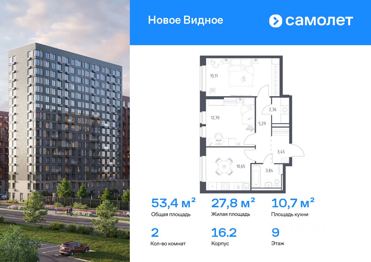 Строим кварталы для жизни с заботой о будущем. Предлагается 2-комнатная квартира комфорт-класса 53,4 кв.м в корпусе 16.2 на 9 этаже, в ЖК "Новое Видное"
