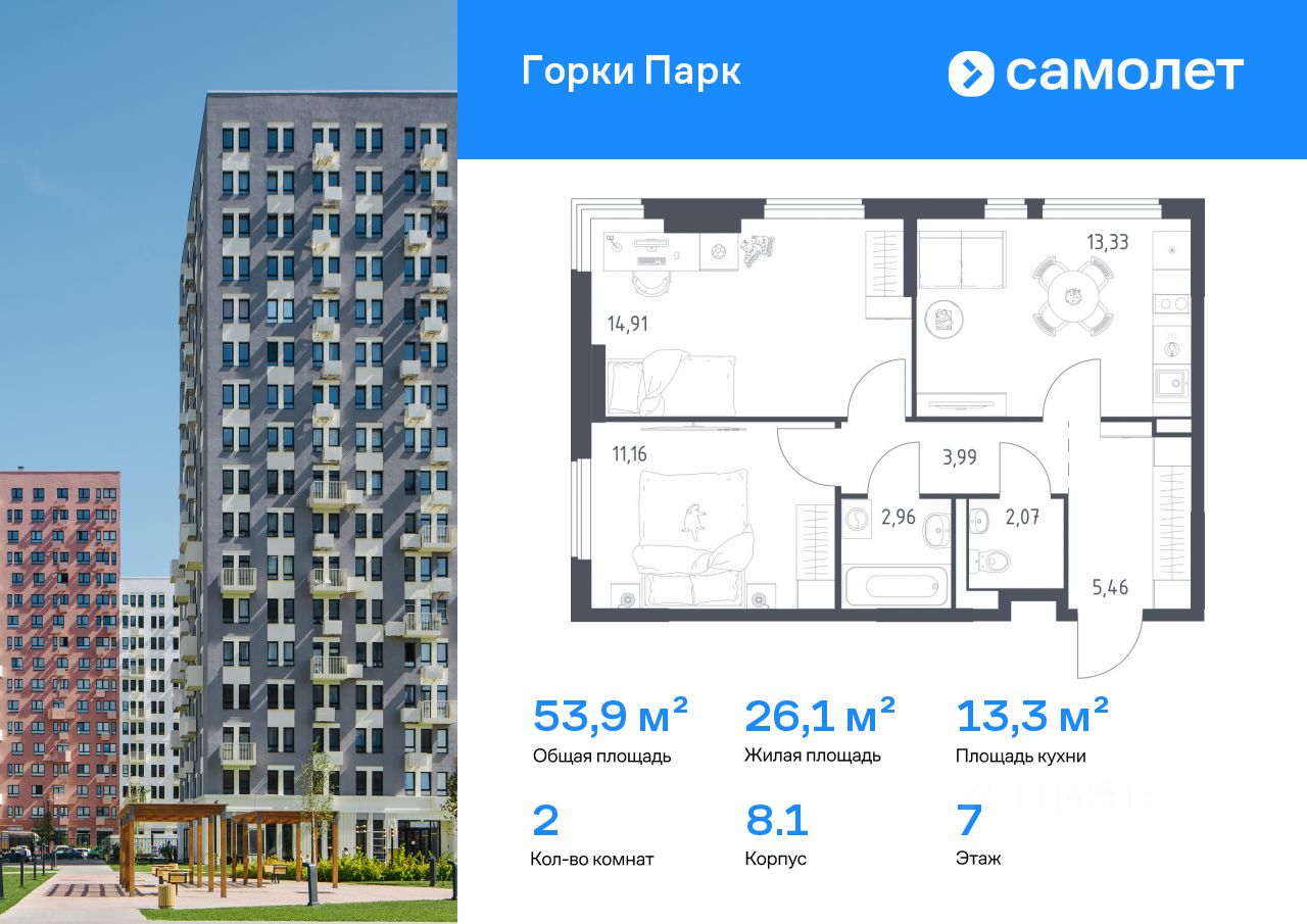 Строим кварталы для жизни с заботой о будущем. Предлагается 2-комнатная квартира комфорт-класса 53,88 кв.м в корпусе 8.1 на 7 этаже, в ЖК "Горки Парк"