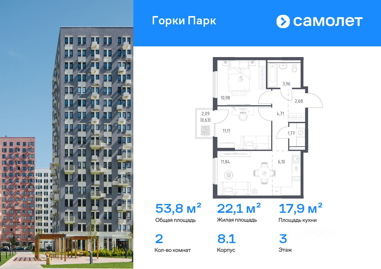 Строим кварталы для жизни с заботой о будущем. Предлагается 2-комнатная квартира комфорт-класса 53,78 кв.м в корпусе 8.1 на 3 этаже, в ЖК "Горки Парк"