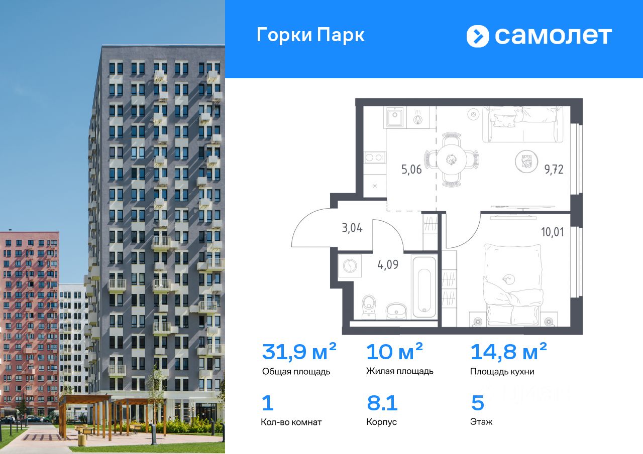 Строим кварталы для жизни с заботой о будущем. Предлагается 1-комнатная квартира комфорт-класса 31,92 кв.м в корпусе 8.1 на 5 этаже, в ЖК "Горки Парк"
