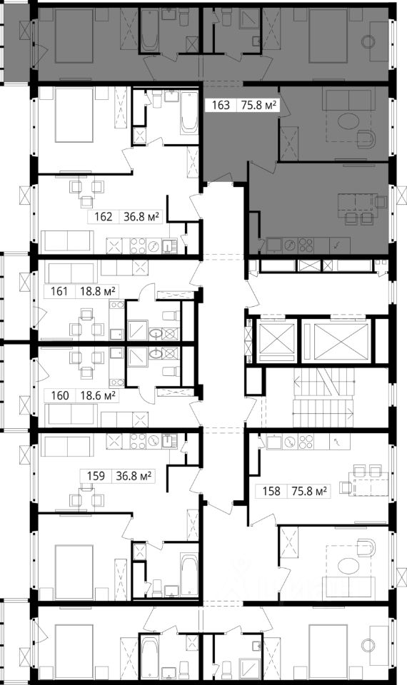 Семнадцатиэтажный корпус "Левитан" состоит из 13 секций, образующих в плане закрытый периметр двора.