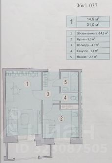 Площадь 31,3 м², жилая комната 15,2 м², кухня 8,0 м², коридор 4,0 м², с/у 1,4м², ванная 2,7 м². Квартира расположена на 2 этаже 8-этажного монолитно-кирпичного дома. В комнате - балкон.