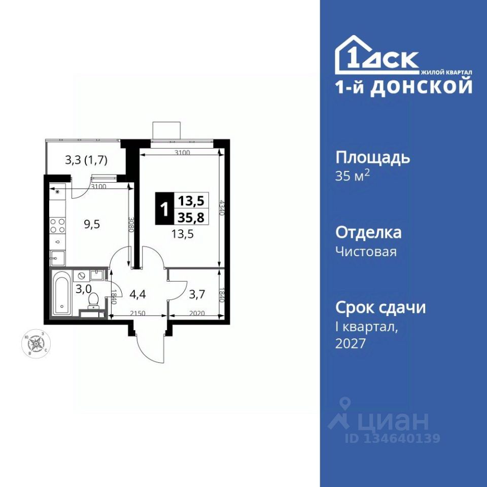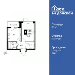 Продаётся 1-к квартира номер 65 общей площадью 35.8 кв.м. на 8-м этаже 24 этажного здания. Чистовая отделка.