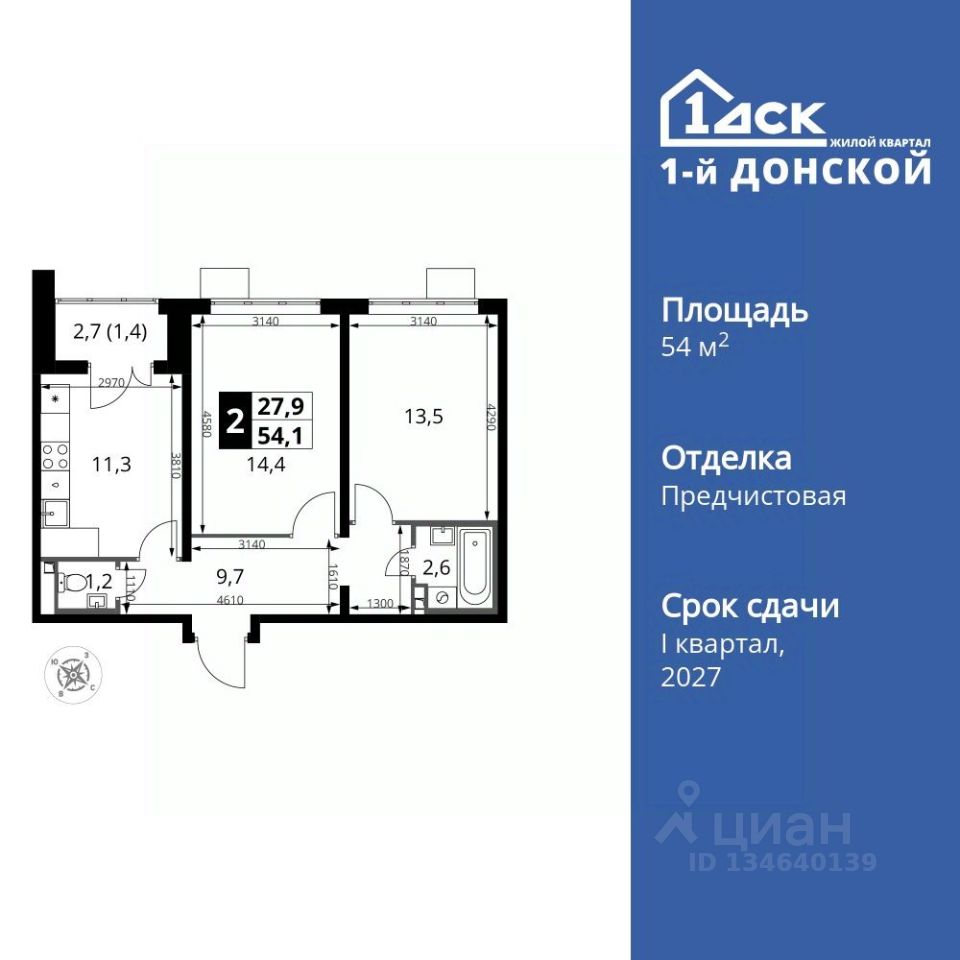 Продаётся 2-к квартира номер 664 общей площадью 54.1 кв.м. на 22-м этаже 24 этажного здания. Отделка Whitebox.