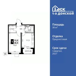 Продаётся 1-к квартира номер 451 общей площадью 38.9 кв.м. на 22-м этаже 24 этажного дома. Отделка Whitebox.
