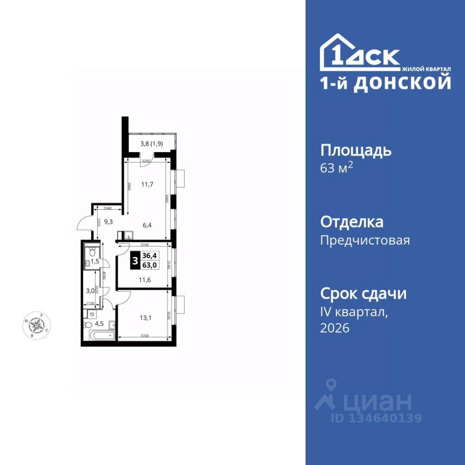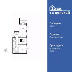 Продаётся 3-к квартира номер 252 общей площадью 63 кв.м. на 24-м этаже 24 этажного дома. Отделка Whitebox.