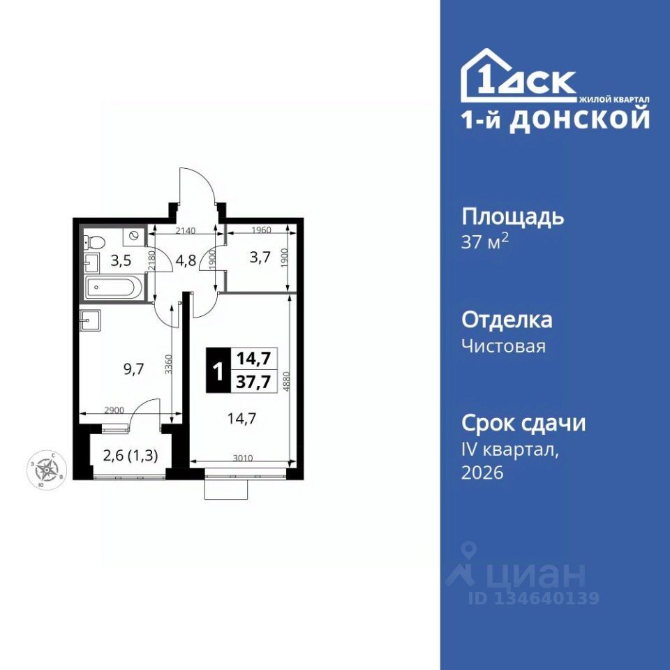 Продаётся 1-к квартира номер 283 общей площадью 37.7 кв.м. на 4-м этаже 24 этажного дома. Чистовая отделка.