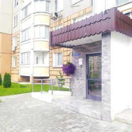 Современный фасад подъезда, бесконтактная кнопка открытия двери подъезда изнутри.