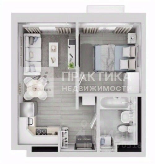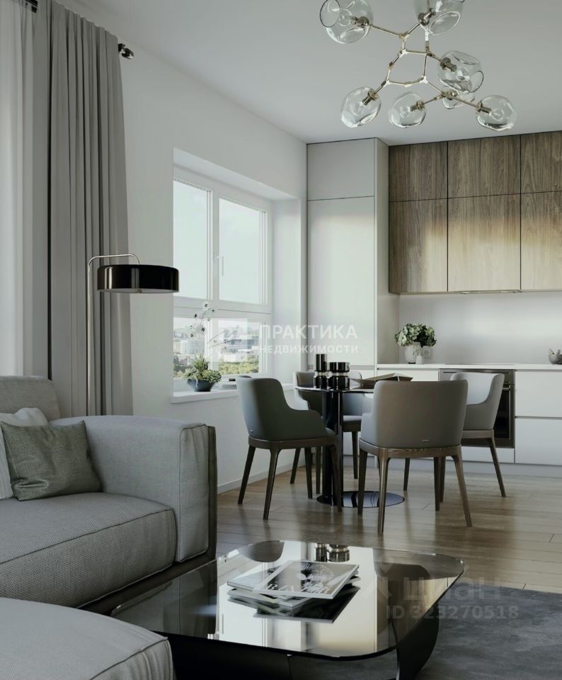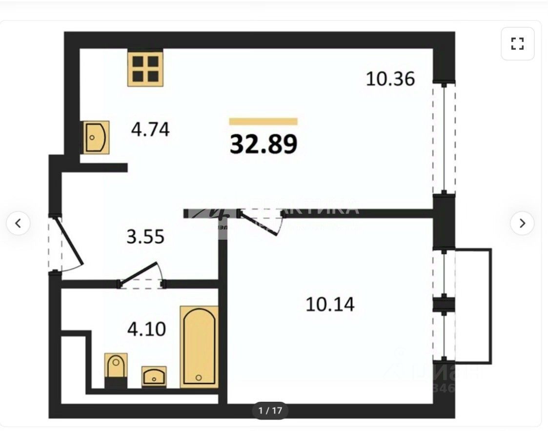 1-комнатная квартира общей площадью 33,5 м² с балконом и видом на улицу, расположенная на 10 этаже 17-этажного монолитного дома. Кухня-гостиная 15 м2 и комната 10,14 м² с чистовой отделкой: ламинат, обои, натяжные потолки, кондиционер. В прихожей 3,55 м² достаточно места для систем хранения, ванная 4,10 м² с керамогранитом на полу и керамической плиткой на стенах, белоснежная сантехника.