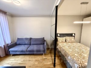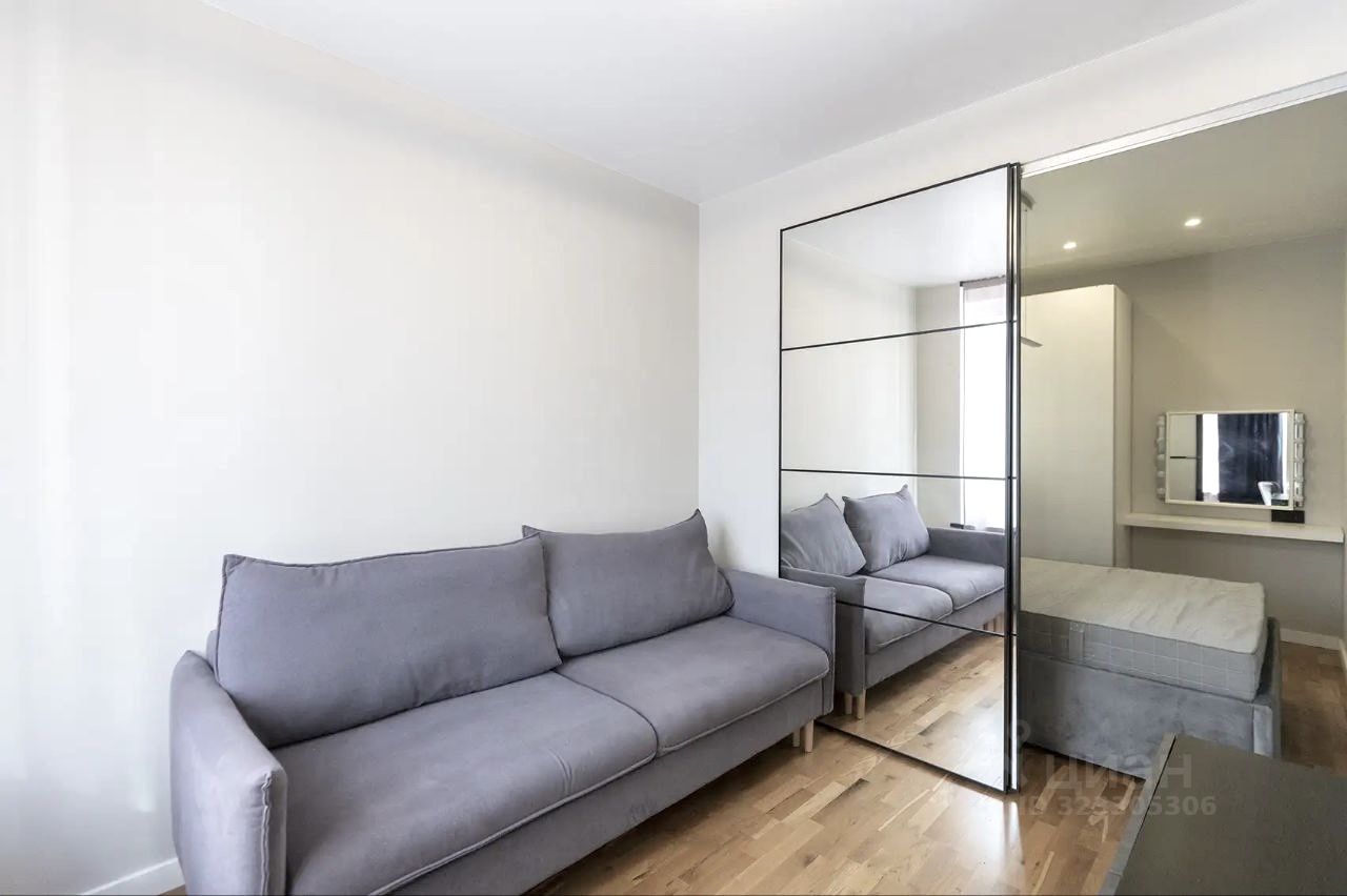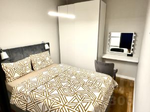 В спальне полноценная двуспальная кровать, шкаф для одежды и вещей. Столик с зеркалом для косметики, макияжа или работы.