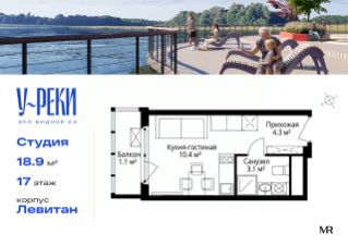 Продаётся студия общей площадью 18.90 м² с чистовой отделкой в ЖК "У реки. Эко Видное 2.0" на 17-м этаже 17 этажного корпуса Левитан.