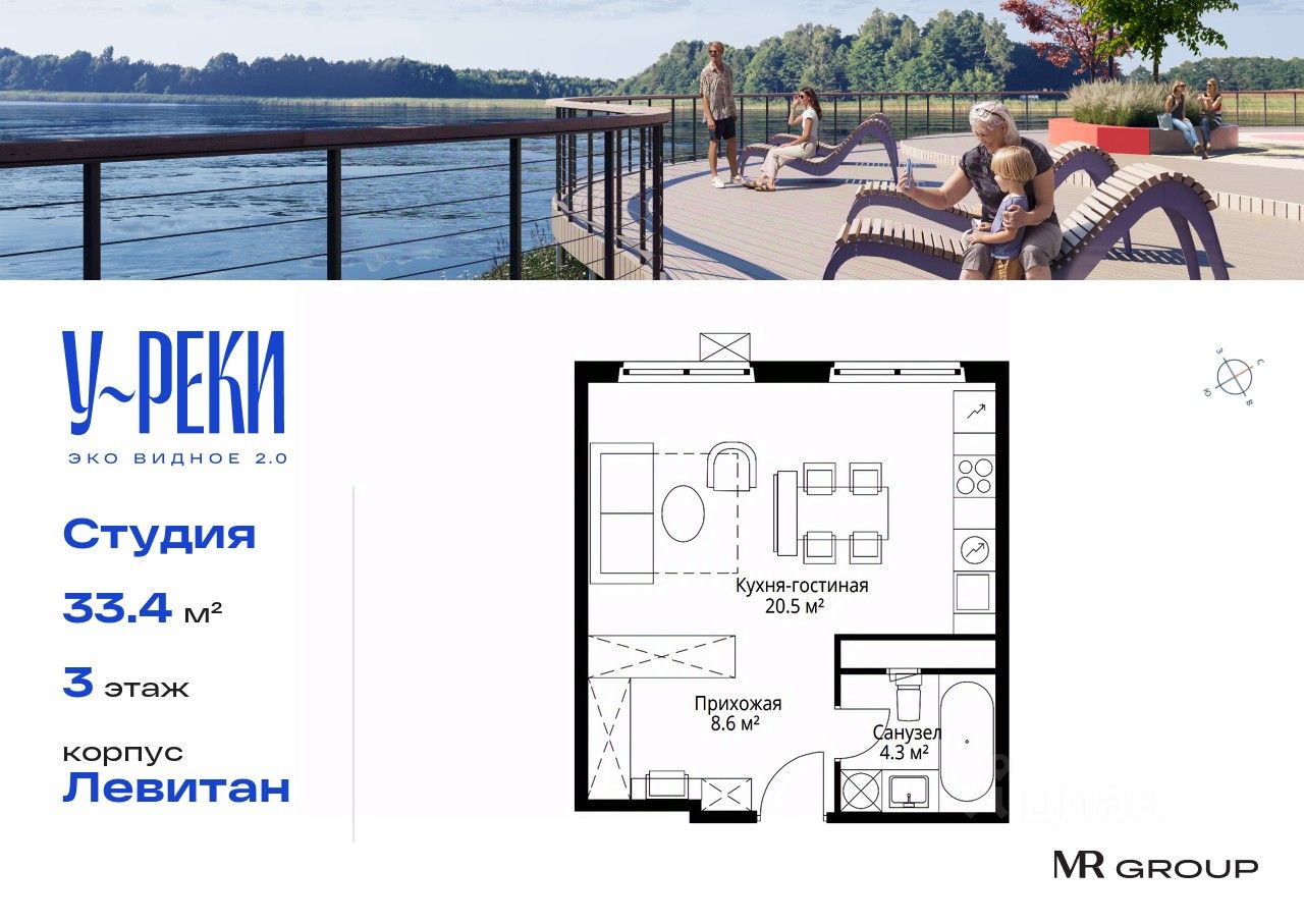 Продаётся студия общей площадью 33.40 м² с чистовой отделкой в ЖК "У реки. Эко Видное 2.0" на 3-м этаже 17 этажного корпуса Левитан.
