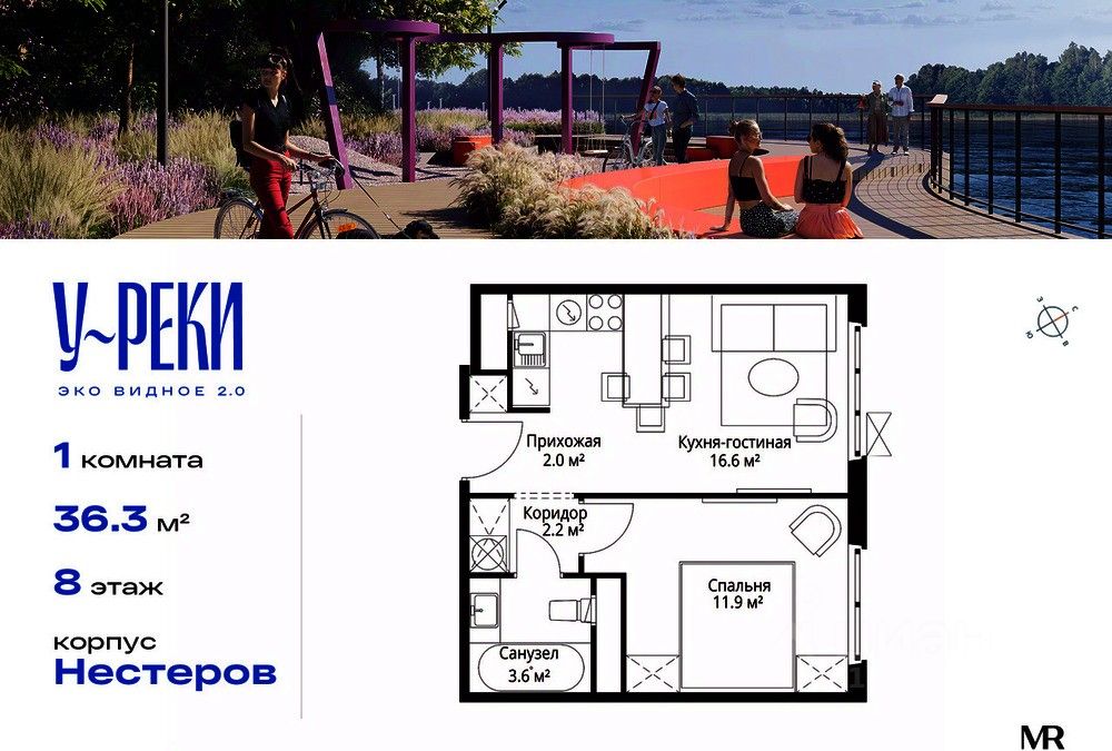 Продаётся 1-комнатная квартира общей площадью 36.30 м² с предчистовой отделкой в ЖК "У реки. Эко Видное 2.0" на 8-м этаже корпуса Нестеров.