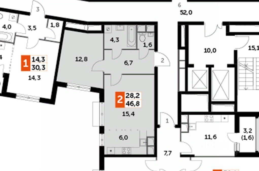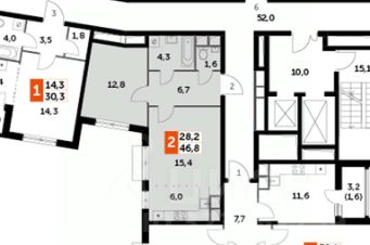 Корпус 8, секция 5.Этаж 7. Общая площадь 46,8 м кв.. Кухня 6 м.кв., жилая 28,2 м.кв..