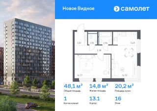Строим кварталы для жизни с заботой о будущем. Предлагается 1-комнатная квартира комфорт-класса 48,06 кв.м в корпусе 13.1 на 16 этаже, в ЖК "Новое Видное"