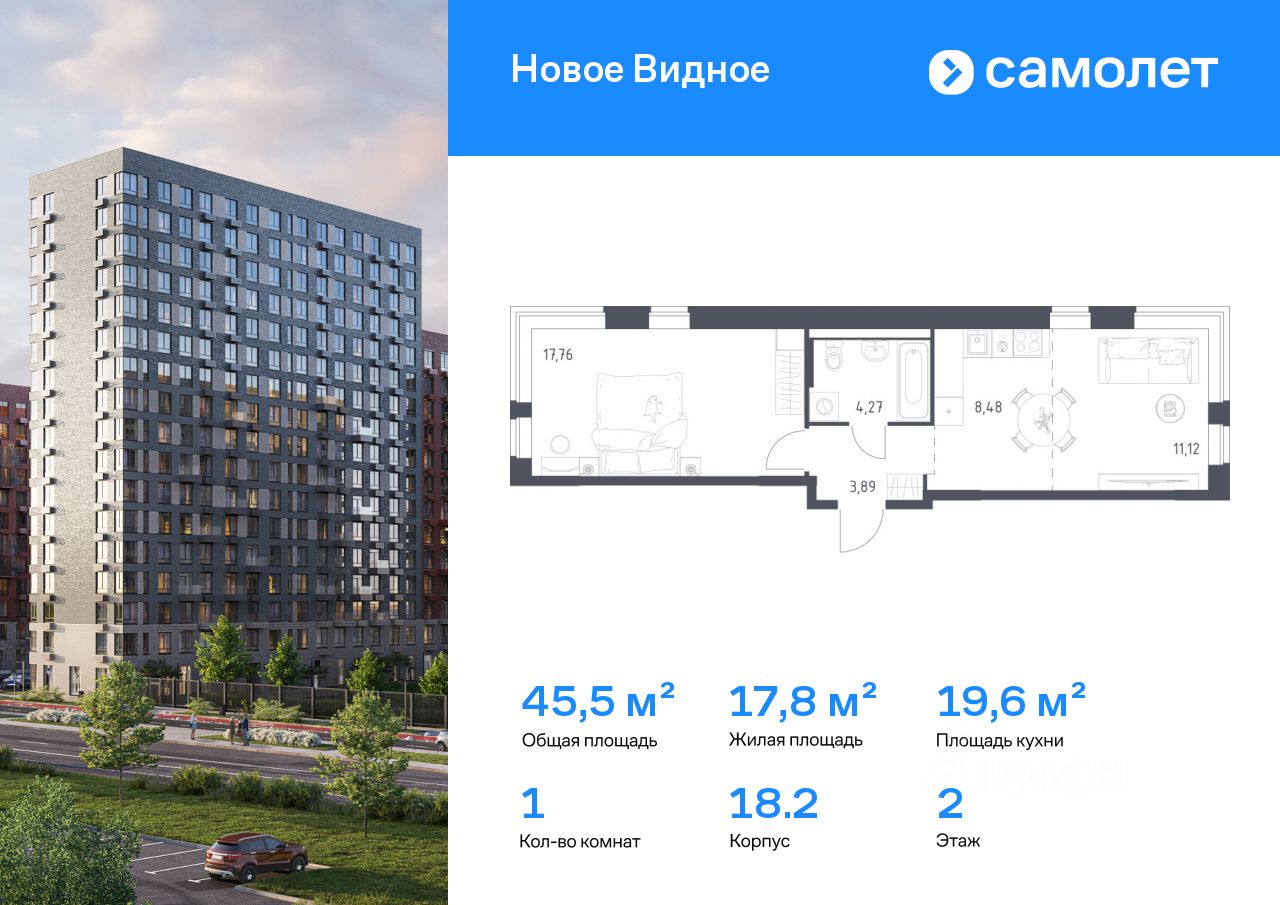 Строим кварталы для жизни с заботой о будущем. Предлагается 1-комнатная квартира комфорт-класса 45,52 кв.м в корпусе 18.2 на 2 этаже, в ЖК "Новое Видное"