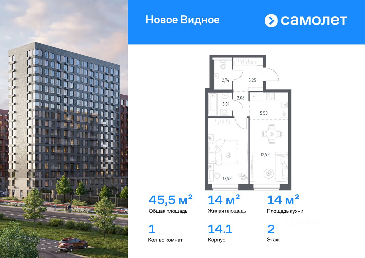 Строим кварталы для жизни с заботой о будущем. Предлагается 1-комнатная квартира комфорт-класса 45,48 кв.м в корпусе 14.1 на 2 этаже, в ЖК "Новое Видное"
