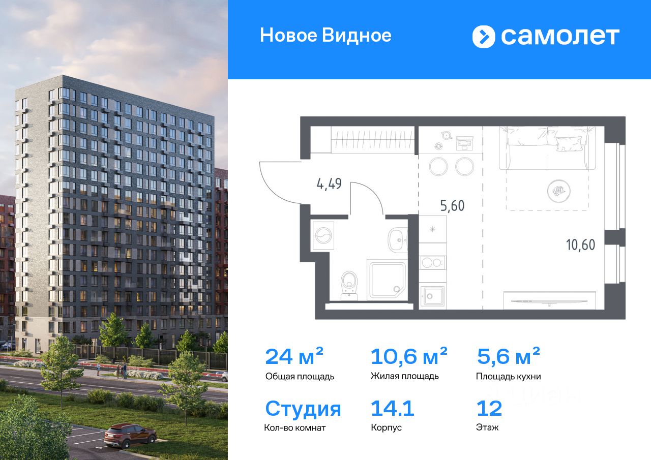 Строим кварталы для жизни с заботой о будущем. Предлагается квартира студия комфорт-класса 24,02 кв.м в корпусе 14.1 на 12 этаже, в ЖК "Новое Видное"
