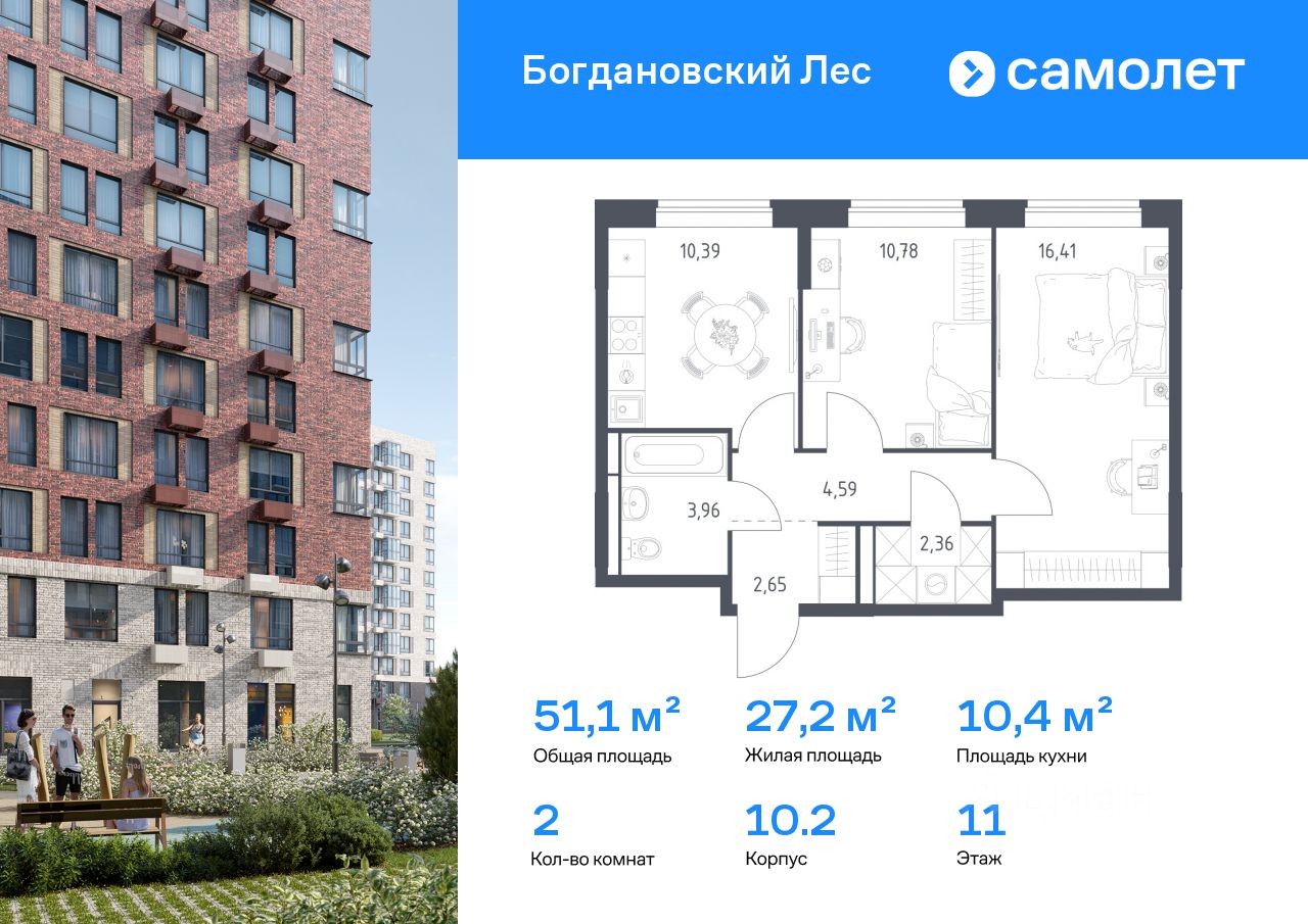 Строим кварталы для жизни с заботой о будущем. Предлагается 2-комнатная квартира комфорт-класса 51,14 кв.м в корпусе 10.2 на 11 этаже, в ЖК "Богдановский Лес"