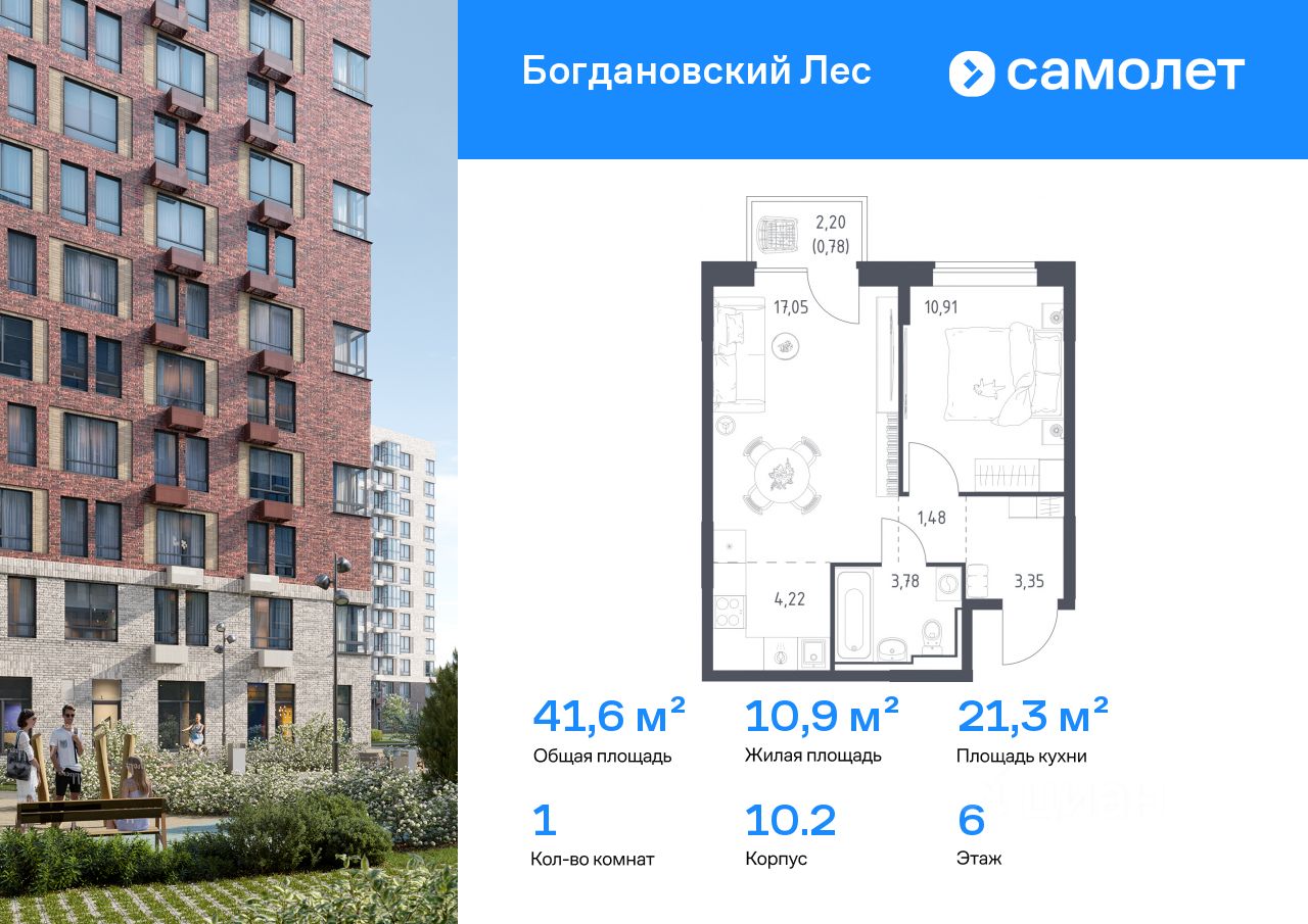 Строим кварталы для жизни с заботой о будущем. Предлагается 1-комнатная квартира комфорт-класса 41,57 кв.м в корпусе 10.2 на 6 этаже, в ЖК "Богдановский Лес"