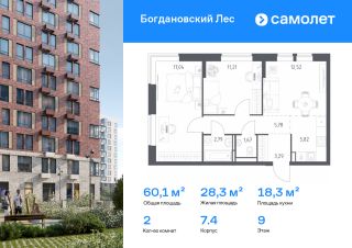 Строим кварталы для жизни с заботой о будущем. Предлагается 2-комнатная квартира комфорт-класса 60,12 кв.м в корпусе 7.4 на 9 этаже, в ЖК "Богдановский Лес"
