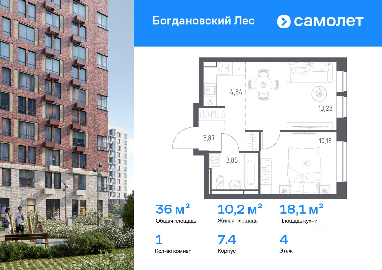 Строим кварталы для жизни с заботой о будущем. Предлагается 1-комнатная квартира комфорт-класса 36,02 кв.м в корпусе 7.4 на 4 этаже, в ЖК "Богдановский Лес"