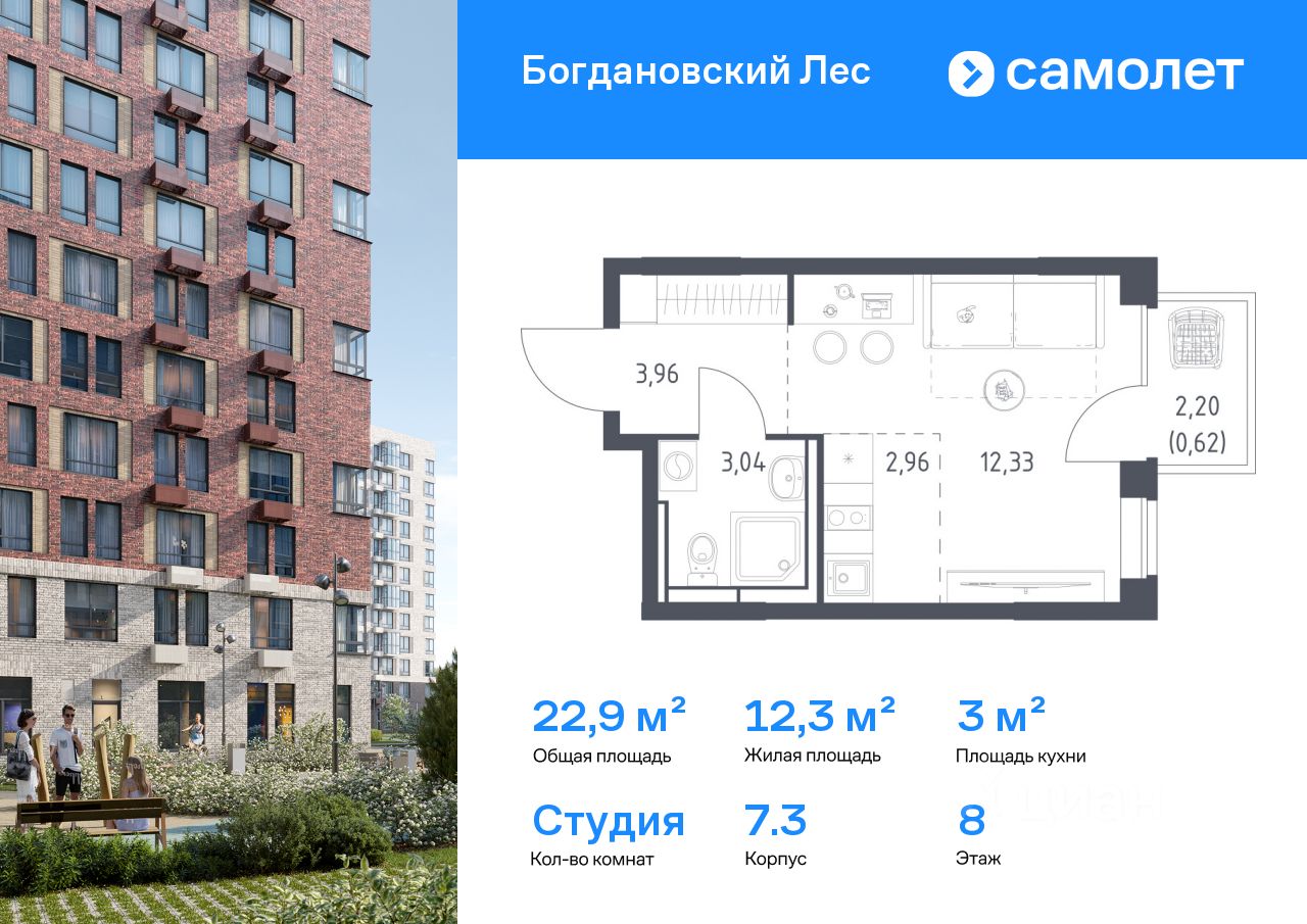 Строим кварталы для жизни с заботой о будущем. Предлагается квартира студия комфорт-класса 22,91 кв.м в корпусе 7.3 на 8 этаже, в ЖК "Богдановский Лес" Квартира с чистовой отделкой. Доступность дополнительных опций уточняйте у застройщика. Приобрести квартиру возможно по специальным акциям от застройщика, с текущими условиями акций можно ознакомиться в блоке "Акций". Цена динамическая и может отличаться, уточняйте актуальность у застройщика. "Богдановский Лес" находится в 17 км от МКАДа, но после открытия Южно-Лыткаринской автодороги расстояние уменьшится до 14 км. Рядом с домом — Коробовский лесопарк. Все дома в "Богдановском Лесу" не выше 12 этажей и располагаются в форме полукруга. Такое решение дарит ощущение камерности. На фасадах — кирпич природных оттенков: от белого и бордо до серого и коричневого. В квартале будет все для жизни: поликлиника и спорткомплекс с бассейном, детские сады и школы. За пределами приватных дворов появятся игровые и спортивные кластеры. "Богдановский Лес" — это: 1. До МКАДа — 20 минут на машине, а после открытия Южно-Лыткаринской автодороги — 12 минут 2. До станции метро "Домодедовская" — полчаса на машине 3. Аэропорт Домодедово — в 35 минутах на машине 4. Рядом — лес, реки Пахра и Людовна, Большой Людовинский пруд с зоной отдыха 5. Экомаршрут в Коробовском лесопарке рядом с домом, который соединит кварталы: "Пригород Лесное", "Горки Парк" и "Богдановский Лес" 6. Национальный конный парк "Русь" и парк-отель "Орловский" в 1020 минутах пешком 7. Аквапарк рядом с кварталом — в будущем на территории парк-отеля "Орловский" 8. Прогулочный маршрут через лесопарк 9. Монолитные дома комфортной высоты — от 11 до 12 этажей 10. 4 детских сада, 3 школы и поликлиника, торговый центр, спорткомплекс с бассейном 11. Воркаут-пространства и велопешеходный бульвар 12. Многоуровневые паркинги в пешей доступности 13. Планировки с постирочными комнатами, угловыми окнами с видами на лес